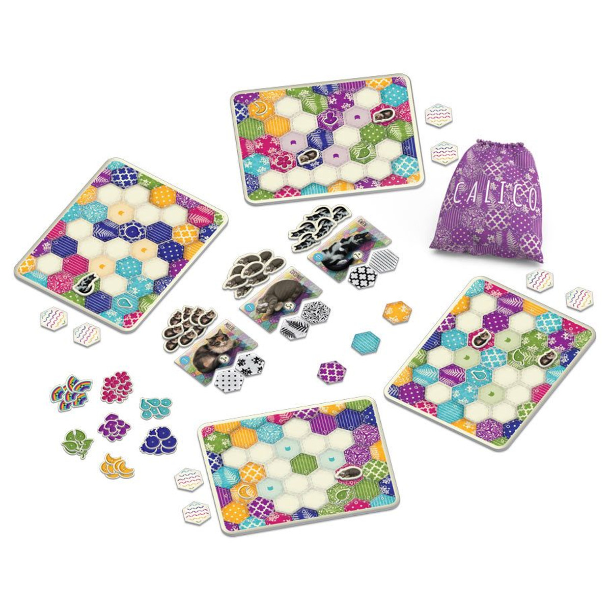 In Calico, players compete to sew the coziest quilt as they collect and place patches of different colors and patterns. Each quilt has a particular pattern that must be followed, and players are also trying to create color and pattern combinations that are not only aesthetically pleasing, but also able to attract the cuddliest cats!