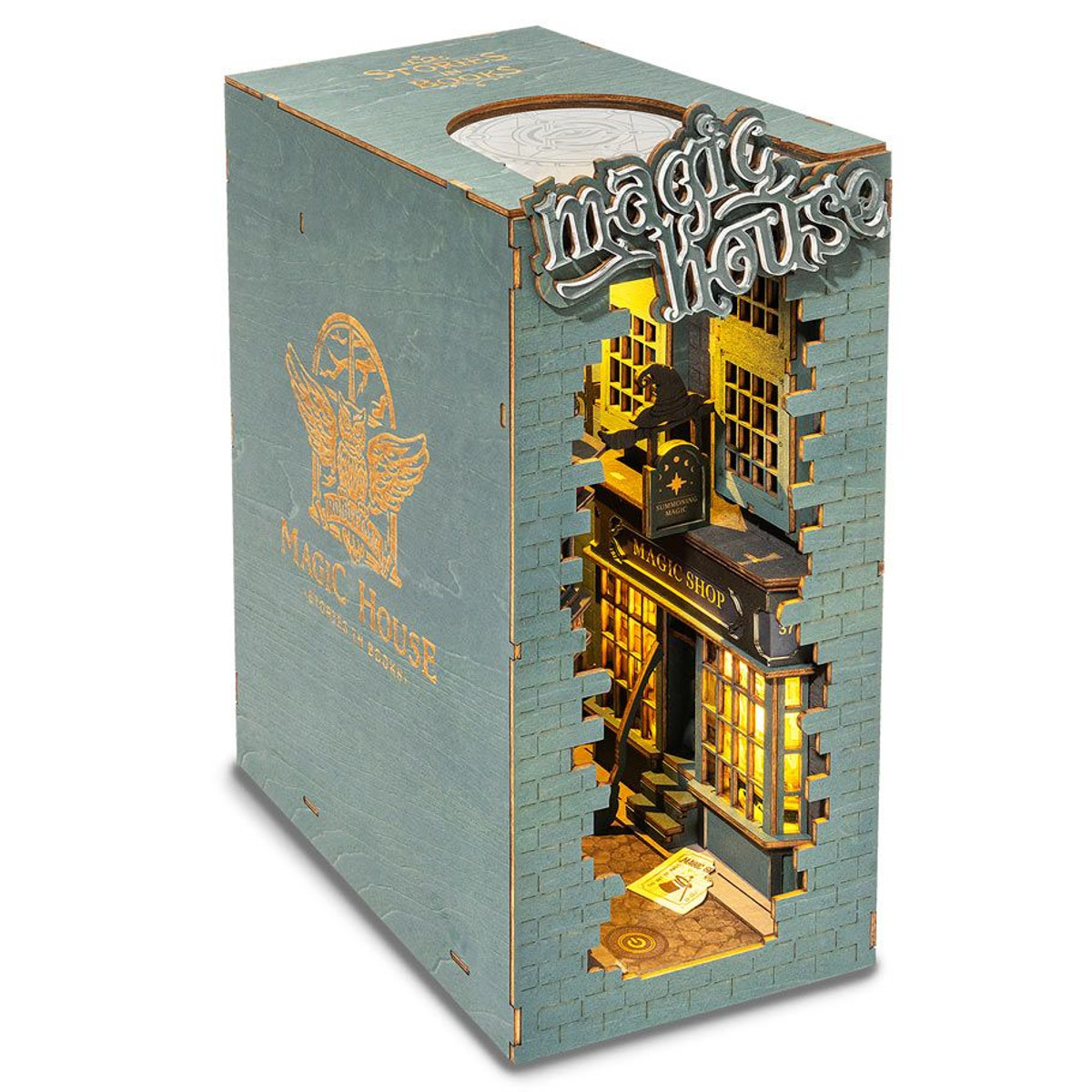 Magic House is a Book Nook Book End is a DIY bookshelf decoration in form of a mysterious magic alley DIY miniature house that only those who can do magic can enter. Use your hands to assemble all the house parts to decorate your bookshelf as a book nook insert. The included warm touch light can illuminate your bookshelf even at night!