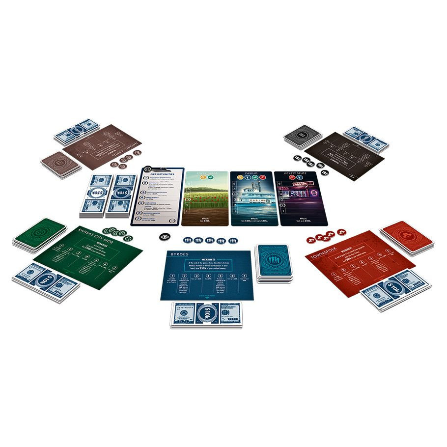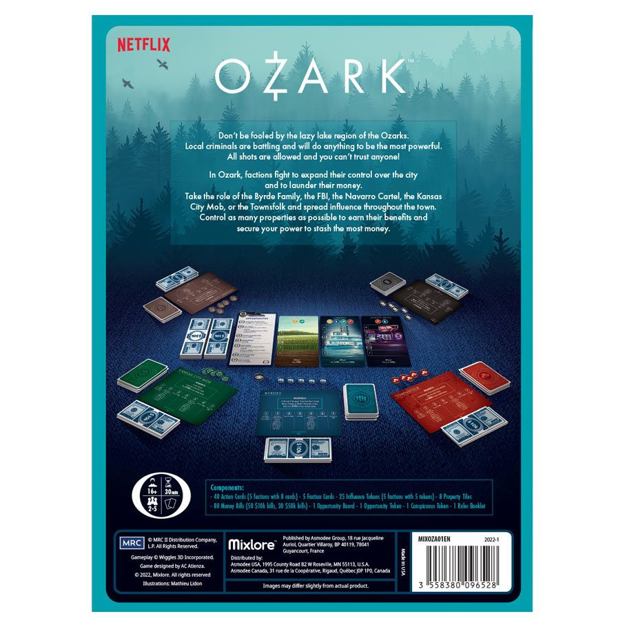 Warring gang factions vie for control over the summer resort town of Osage Beach… and the Byrde family is caught in the middle! Take on the role of the Byrdes, Navarro Cartel, Kansas City Mob, Townsfolk or the FBI to spread influence throughout the town. Control properties to earn lucrative benefits like gaining money – or laundering it to secure your wealth. Balance force with finesse to outmaneuver your opponents and dominate the Ozarks!