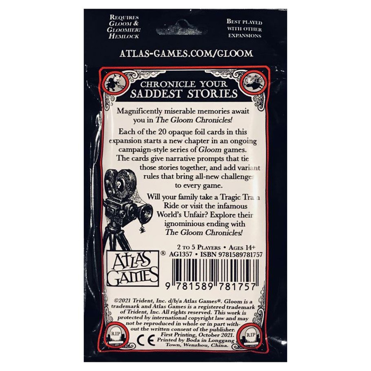 In Gloom, you and your friends weave tales of woe. But where does the story begin? Each card in The Gloom Chronicles expansion starts a new chapter for your ongoing game of Gloom, ties those games together as a serialized campaign, and adds variant rules bringing new challenges to the story. You can choose a card at random, or you can start from the beginning and explore the ongoing chronicle of your family through an extended campaign. Your story begins with the Unhappy Birthday …